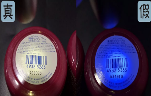 正品的資生堂尿素護(hù)手霜底部的貼紙照射之后不會(huì)有熒光反應(yīng),而假貨的資生堂尿素護(hù)手霜底部貼紙有明顯的熒光反應(yīng)。