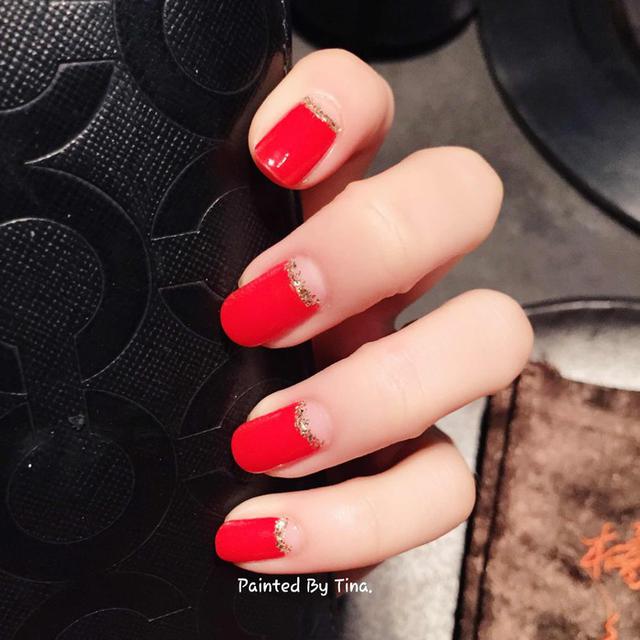紅色美甲用金色亮片鑲個(gè)月牙邊也很漂亮的哦。
