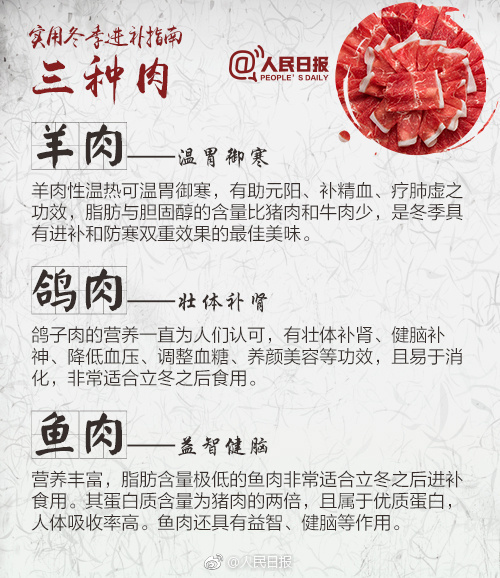 1、羊肉:羊肉性味甘溫,含豐富的脂肪、蛋白質(zhì)、碳水化合物、無機(jī)鹽和鈣、磷、鐵等人體所必需的營(yíng)養(yǎng)成分,常被人們用作冬季御寒和進(jìn)補(bǔ)壯陽(yáng)的佳品,具有暖中補(bǔ)腎虛、開胃健脾、御寒去濕之功效。