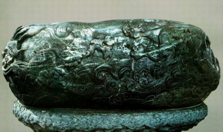 現(xiàn)存最大的玉雕甕 瀆山大玉海,又稱黑玉酒甕、玉甕,現(xiàn)存北京北海的團(tuán) 城內(nèi)t這是我國(guó)最大的一件玉雕甕。 瀆山大玉海,玉質(zhì)青白中帶黑,屬于雜色墨黑。甕口橢 .圓形;高70厘米,長(zhǎng)182厘米,寬135厘米,最大周圍493厘米,膛深55厘米,重約3500公斤。它的周身浮雕&濤洶浦的大海和海中的各種動(dòng)物,如海龍、海馬、海豬、海鹿、海 犀等,以陰陽(yáng)不同的線條表現(xiàn)海中動(dòng)物的身形、毛發(fā)、胡 須、鱗甲和翅膀;以不同紋樣顯示海的激流、旋渦和波濤。 整個(gè)造...