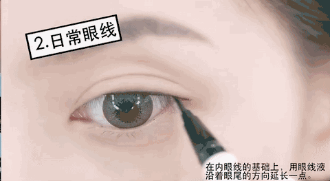 第二種是日常眼線,也是每天都可以畫、不容易出錯(cuò),非常適合初學(xué)者的。在內(nèi)眼線的基礎(chǔ)上,用眼線液沿著眼尾的方向延長一點(diǎn),初學(xué)者的話可以用手指輕抬起上眼皮畫,這樣不容易出錯(cuò)。