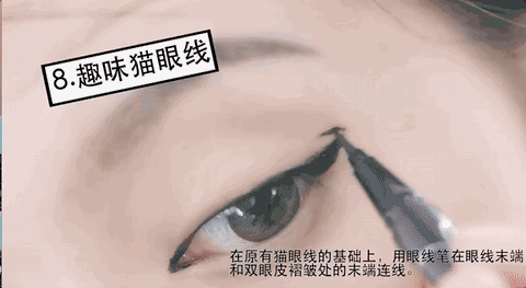 第八種是趣味貓眼線,在原有貓眼線的基礎(chǔ)上,用眼線筆在眼線末端和雙眼皮褶皺處的末端連線。這個(gè)眼線比較好玩,但是我知道你們要說不日常!