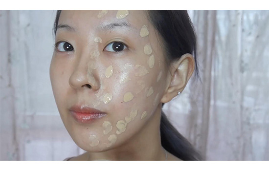 第一步:取適量的粉底液均勻的點(diǎn)在臉上,注意不光是臉蛋,還有鼻翼,下巴、額頭和輪廓線都要點(diǎn)上粉底液。