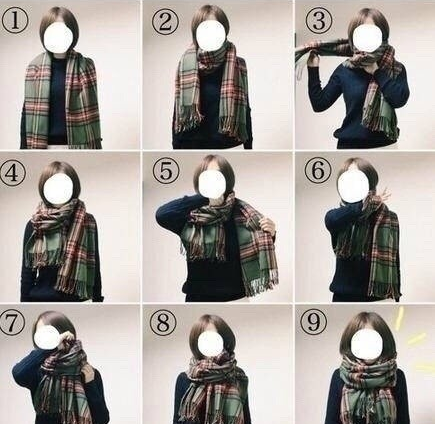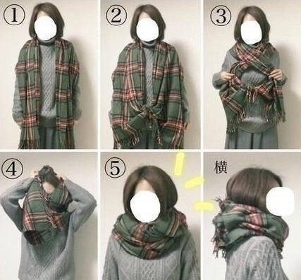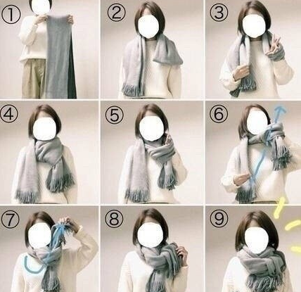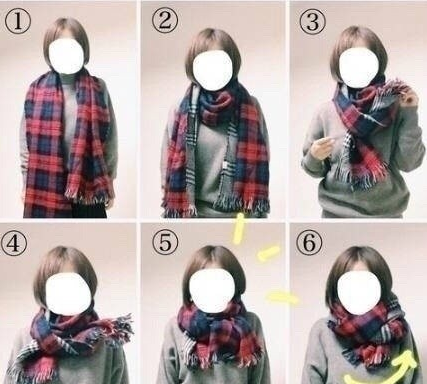 step 1:把圍巾交叉繞在脖子上,左邊在上,然后將右邊那段沿箭頭方向穿過(guò)空隙
