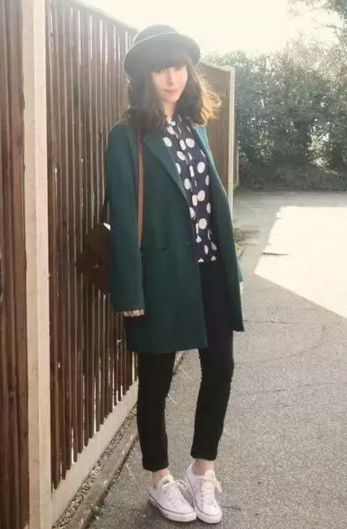 6. 墨綠色大衣+印花上衣+黑色鉛筆褲+帆布鞋