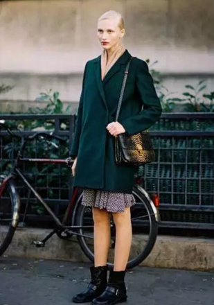 當(dāng)然還有比較別具一格的搭配方法,選擇長于墨綠色大衣的裙子,剛好可以露出裙擺,配上帥氣短靴,這樣的混搭風(fēng)很適合喜歡追求個性風(fēng)尚的mm.