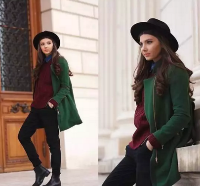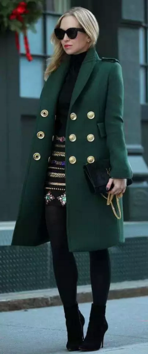 和其他各種顏色大衣一樣,只要搭上一身黑也是錯不了滴,但是墨綠色配上黑色,對于亞洲萌妹紙來說,難免會有一些沉悶,所以喜歡熟女御姐風(fēng)的mm倒是很好駕馭這套搭配,不管是搭配小黑裙還是黑色套裝,都別有一番摩登之感。
