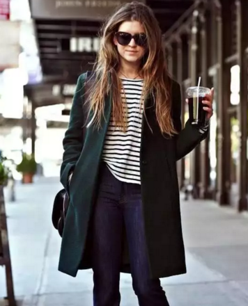2. 墨綠色大衣+黑白條紋衫+牛仔褲