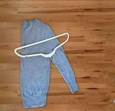 首先將毛衣縱向?qū)φ?,正面朝外將衣架顛倒放位置。讓掛鉤位于毛衣腋窩位置。