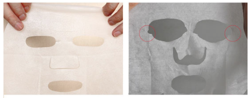 正品的眼角位置是沒有切口的,假貨的面膜紙比較粗糙,縫隙比較大。