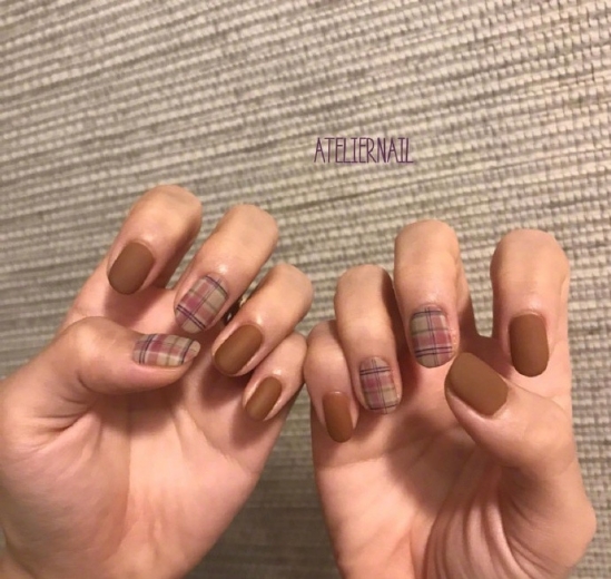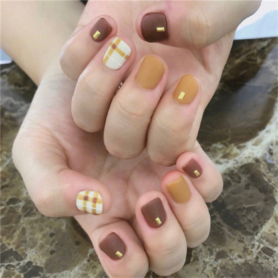 棕色加土黃色原本就是非常秋冬的顏色了,加上格子的元素,則是一款不折不撓的秋天美甲了。