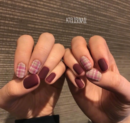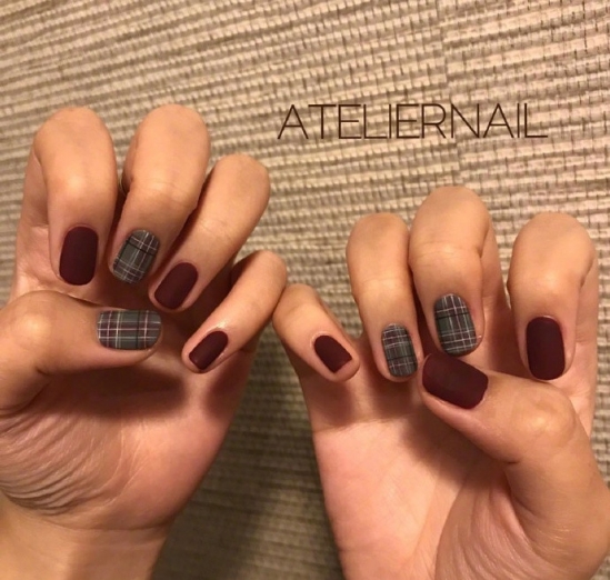 酒紅色磨砂美甲你喜歡嗎?搭配紅色格子,不僅有撞色之美更是吸睛,冬天涂了一定會美。