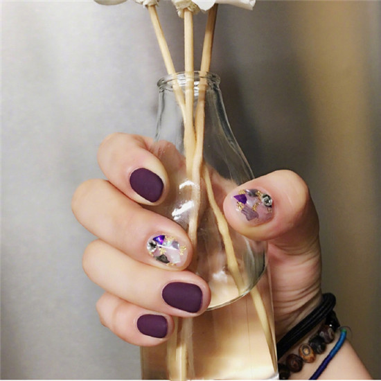 深紫色的磨砂美甲,原本是有些沉悶的,但是中間加了一個透明質(zhì)感的紫色美甲,瞬間打破沉悶感。