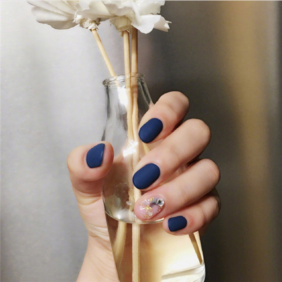 深藍色是非常適合秋天的顏色,磨砂的質(zhì)感賦予了它一絲壓抑感,搭配有個透明質(zhì)感的美甲,覺得人都從秋冬的壓抑感中逃離出來。