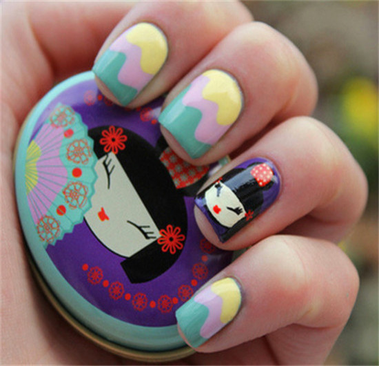 有種日式美甲的感覺,手繪的舞姬,在波浪糖果色美甲中,很特別,同時也非常的好看。