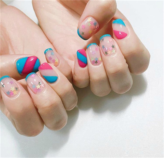 像獨(dú)角獸一樣的炫彩配色,加上帶有透明感的小星星,像童話世界帶來的夢幻美甲。