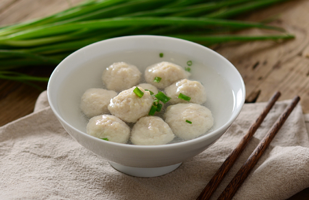 材料:白蘿卜150g,自制魚丸100g,芹菜末1茶匙(5g),鹽,白胡椒粉各1/2茶匙(3g),香油1茶匙(5ml),高湯1碗(250ml)。