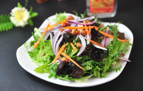 材料:木耳,銀耳,紅蘿卜絲,蒜粒,香菜,蔥花,芝麻粒,醬油,鹽,醋,糖,香油。