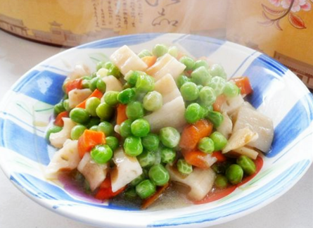材料:蓮藕1塊、豌豆粒200g、胡蘿卜1個(gè)、油適量、鹽適量、蔥適量。