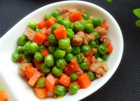 材料:豌豆250克、餃子餡150克、紅蘿卜80克、蒜15克、油適量、鹽1茶匙、糖1茶匙、蠔油1茶匙。
