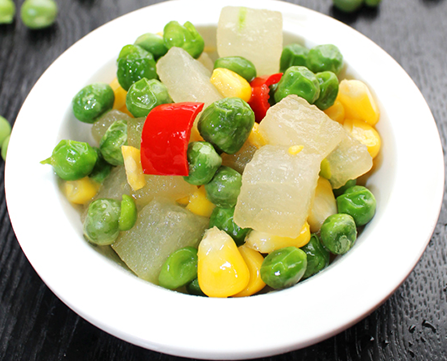 準(zhǔn)備材料:冬瓜適量、豌豆適量、玉米適量、紅椒適量。