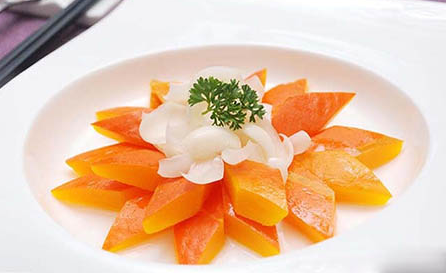 材料:百合100g、南瓜適量、美國杏李適量、蜂蜜適量。