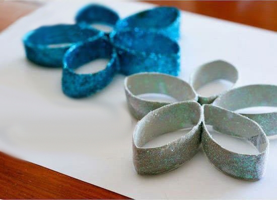 首先我們把卷紙紙筒切成一個個的圈。然后壓扁,五個一組的用膠水粘合在一起做成花的形狀,并用夾子固定。