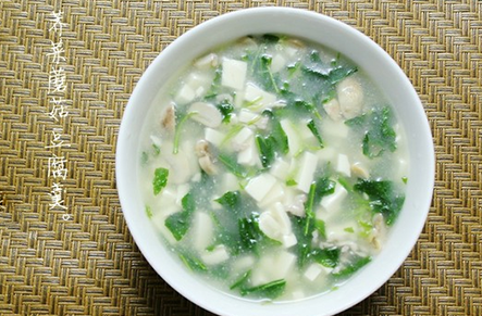 準備材料:薺菜、嫩豆腐、蘑菇、水淀粉、鹽、麻油。