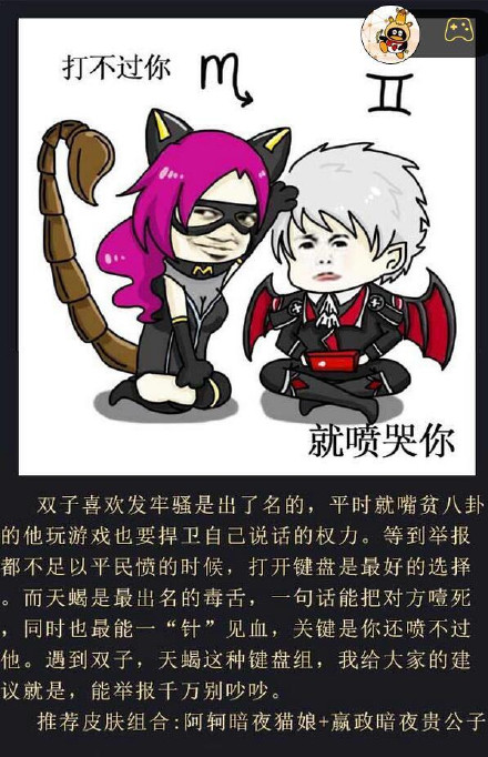 對應(yīng)英豪:宮本武藏、花木蘭→→→→→天蝎座的英豪有著強壯的纏斗才能,被他們近身以后很難全身而退,這類英豪的生存才能極強,不管是打野仍是混線都能飛速的生長,是十二星座中最兇惡的英豪。(要么我弄死你,要么玉石俱焚)