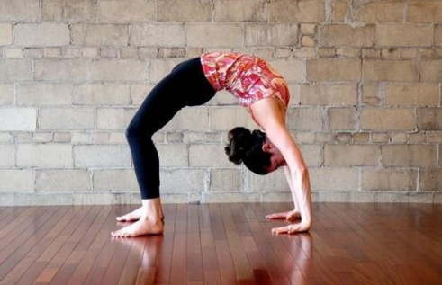 吸氣,雙手雙腳用力撐起身體,盡可能的抬高臀部,使脊柱伸展開。頭部后仰,擠壓雙腳外側(cè)以鍛煉大腿內(nèi)側(cè)肌肉。