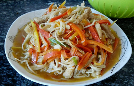 準(zhǔn)備材料:金針菇100g、胡蘿卜100g、木耳30g、蒜苗30g、油適量、鹽適量、蔥姜適量、糖1g、魚露10ml、香醋2ml、香油適量、雞精適量。