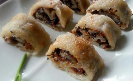 4、把夾了料的面餅卷起來,切成均勻的大小即可。